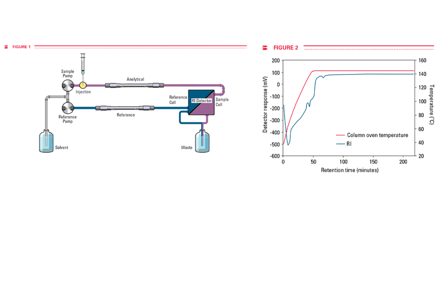 A bomba de amostra conduz o solvente, a partir do reservatório, passando sequencialmente pelos seguintes componentes do sistema: amostrador automático, coluna analítica, lado de amostra da célula do detector RI e, por fim, o recipiente de descarte. Já a bomba de referência conduz o solvente do reservatório através de uma coluna de referência, do lado de referência da célula do detector RI e, então, até o recipiente de descarte.